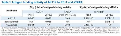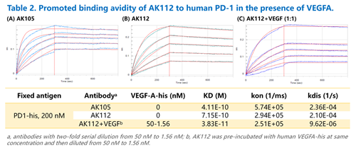 AK112可与人PD-1和VEGF特异性结合且高亲和力