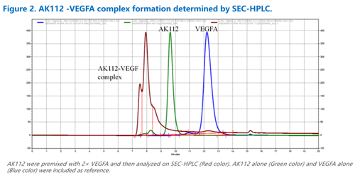 通过尺寸排阻高效液相色谱法(SEC-HPLC)检测AK112-VEGF的复合物形成,发现AK112与VEGF形成可溶性复合物,进一步强化其与PD-1的亲和力。