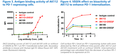 VEGF增强AK112与细胞上的PD-1结合,促进PD-1内化,强化PD-1/PD-L1信号阻滞