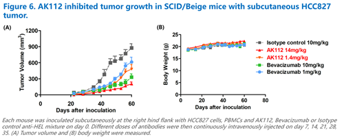 在体内药理学研究中,在植入HCC827细胞的SCID/Beige小鼠中研究AK112的抗肿瘤活性。研究显示,与贝伐珠单抗相比,AK112在小鼠模型中表现出更优秀的抗肿瘤效应。