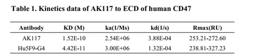 表1. AK117 对人 CD47 细胞外结构域的动力学数据