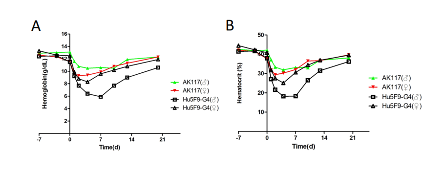 - AK117较Hu5F9-G4,安全性优势突出:在食蟹猴中的毒理学研究数据显示,AK117不引起红细胞凝集,与Hu5F9-G4相比,AK117引起贫血的程度更轻,且快速恢复,安全性更好。