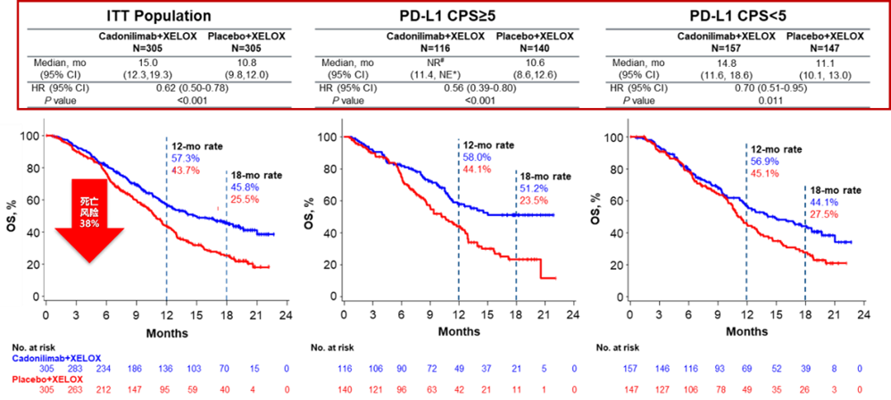 可以看到,COMPASSION-15研究中卡度尼利单抗联合化疗组入组了较高比例的预后较差的患者,包括≥65岁、ECOG PS 1、原发肿瘤位置为胃食管结合部、肝转移、CPS<1、CPS<5的患者,但仍然获得了亮眼的一线治疗生存获益。COMPASSION-15研究中针对PS=1的患者,OS HR=0.60,降低了40%的疾病死亡风险,令人振奋;针对原发灶位置为胃食管结合部的患者OS HR=0.59,针对肝转移患者的OS HR=0.50,实属不易。此外,卡度尼利单抗联合化疗组在PD-L1高表达或低表达患者中均显著获益,可大幅降低疾病进展或死亡风险,具有高肿瘤缓解效力,而且不良反应谱保持一致,未发生特殊不良反应。