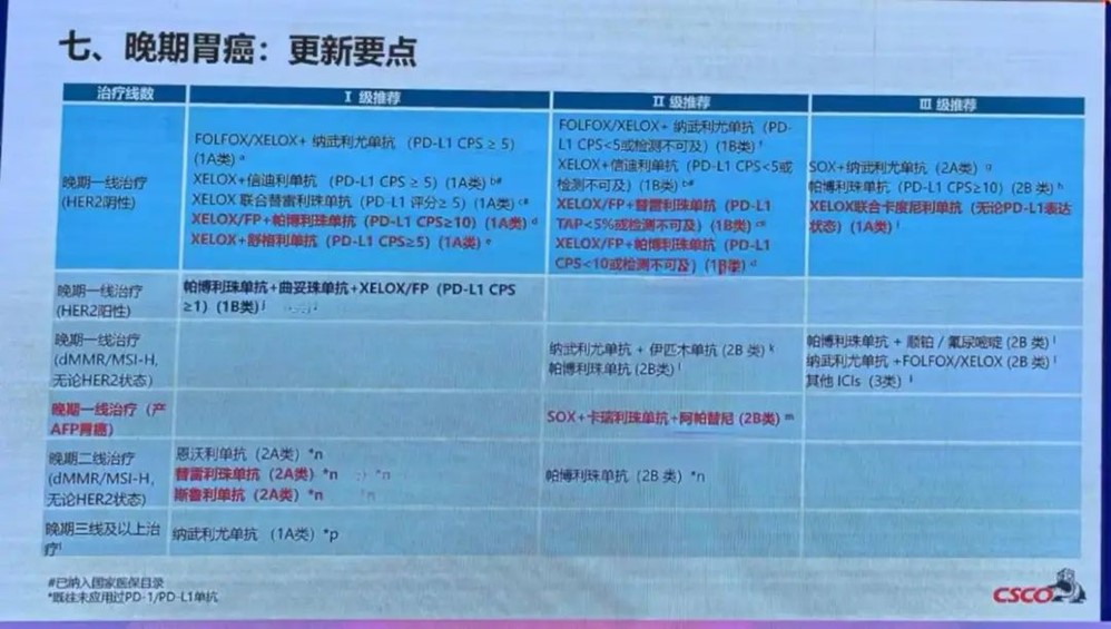 对于晚期胃癌的免疫治疗,现状是随着PD-L1表达增高,患者临床获益趋势增大,多项III期研究结果都显示PD-L1低表达患者一线免疫联合治疗难以获益。但在COMPASSION-15研究中,无论是PD-L1 CPS≥5还是PD-L1 CPS<5人群,都可以获得OS获益,新版指南中也为其追加了新的注释。新版指南中同样更新关于免疫的多项联合方案推荐,对AFP型罕见亚型胃癌,一项前瞻多中心II期AFPGC研究提示了靶免方案的方案,该方案也获得了针对此类患者的II级推荐。在二线治疗中,目前暂无证据支持PD-L1表达作为免疫治疗的指导,II期RAP试验显示雷莫西尤单抗和紫杉醇联合阿维鲁单抗治疗在经治患者的二线治疗中显示出良好的疗效和耐受性,卡度尼利单抗联合普罗西单抗±化疗的临床研究也将于2024年ASCO报告,有望为免疫耐药患者提供更高效的解决方案。