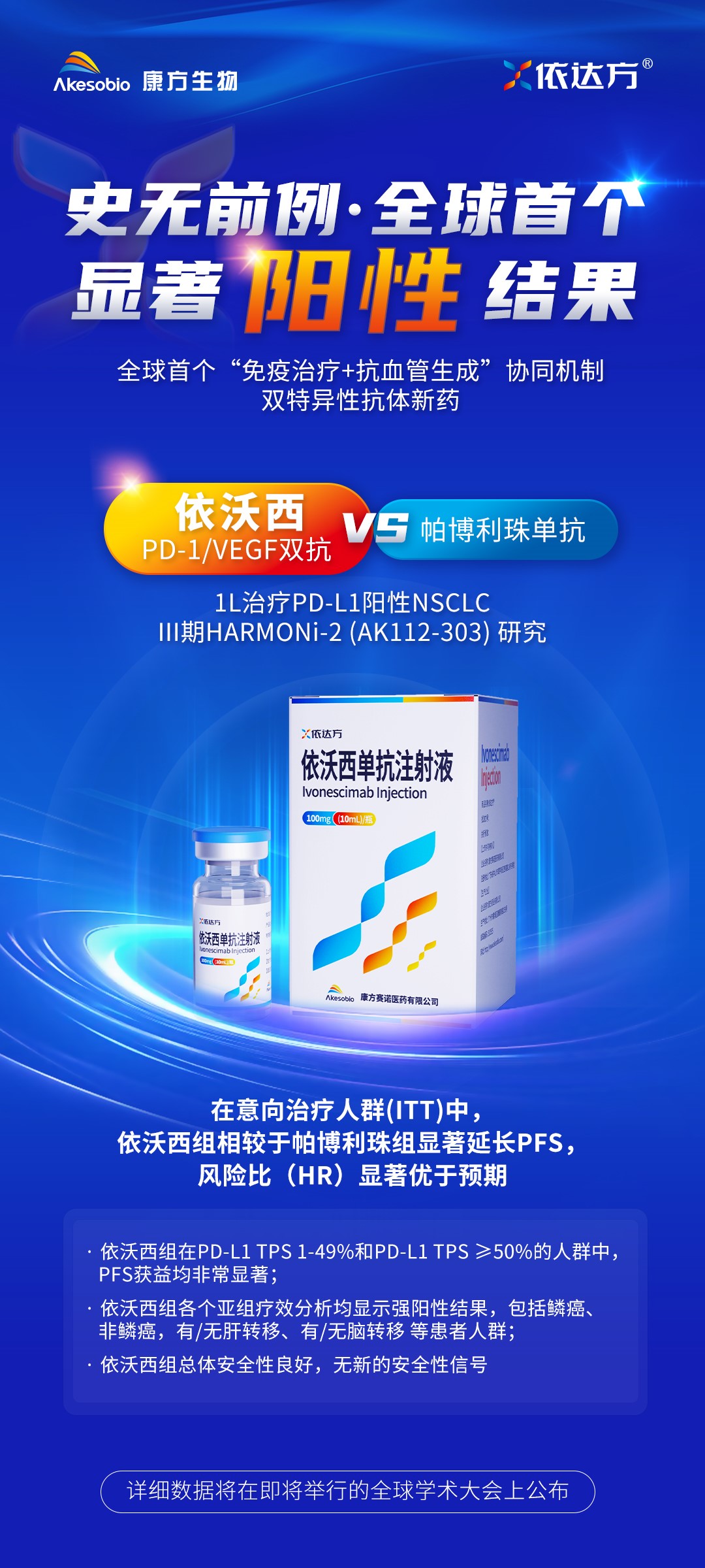 2024年5月31日,安博官方网页版生物(9926.HK)欣喜地宣布,全球首创双特异性抗体新药依沃西单抗注射液(商品名:依达方®,PD-1/VEGF双抗)单药对比帕博利珠单抗一线治疗PD-L1表达阳性(PD-L1 TPS≥1%)的局部晚期或转移性非小细胞肺癌(NSCLC)的注册性III期临床研究(HARMONi-2或AK112-303),由独立数据监察委员会(IDMC)进行的预先设定的期中分析显示强阳性结果:达到无进展生存期(PFS)的主要研究终点。
