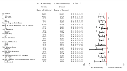 亚组分析显示,几乎所有预设亚组都观察到与总人群一致的无进展生存期获益,并具有显著统计学意义。在接受第三代EGFR-TKI治疗失败(HR 0.48, 95% CI 0.35-0.66)、基线有脑转移(HR 0.40, 95% CI 0.22-0.73)、EGFR突变为19号外显子缺失(HR 0.48, 95% CI 0.32-0.73)以及T790M突变阳性(HR 0.22, 95% CI 0.09-0.54)的患者亚组中,依沃西单抗联合方案均显示出无进展生存期获益优势。