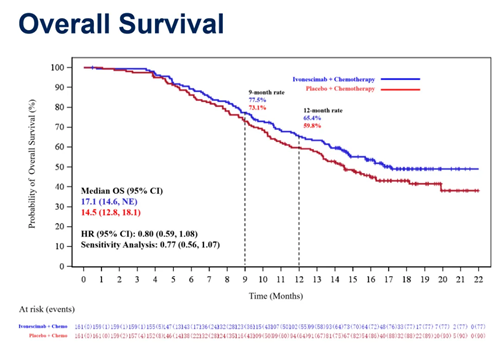依沃西单抗联合化疗对比化疗组的客观缓解率(ORR)为50.6%(95% CI 42.6-58.6)和35.4%(95% CI 28.0-43.3)。截至2023年12月,中位随访时间为17.6个月,依沃西联合方案中位总生存期为17.1个月,对照组中位生存期为14.5个月,降低死亡风险20%(HR 0.8,95% CI: 0.59 ~1.08)。敏感性分析显示,依沃西单抗联合方案组观察到生存期有明显延长趋势,降低死亡风险23%(HR 0.77,95% CI: 0.56 ~1.07 )。