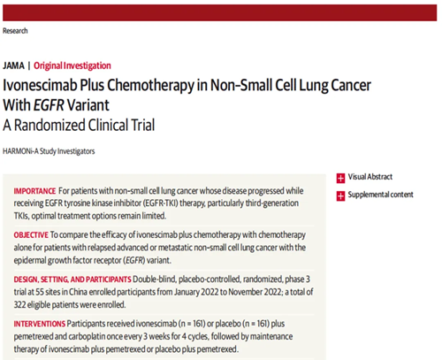 2024年5月31日,中山大学肿瘤防治中心张力教授牵头开展的III期HARMONi-A(AK112-301)研究期中分析结果被2024年美国临床肿瘤学会(ASCO)收录为口头报告,由张力教授在ASCO会上做口头报告。研究结果同步被国际顶尖权威期刊《美国医学会杂志》(Journal of the American Medical Association, JAMA)在线发表。