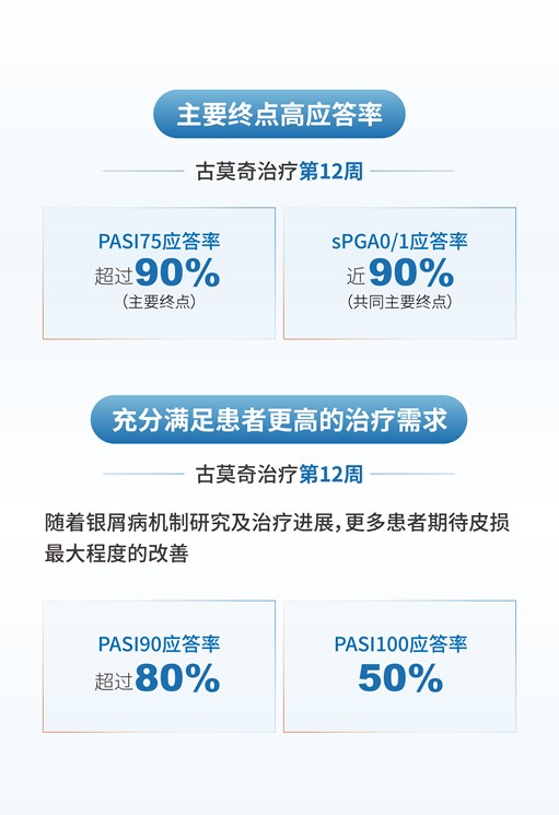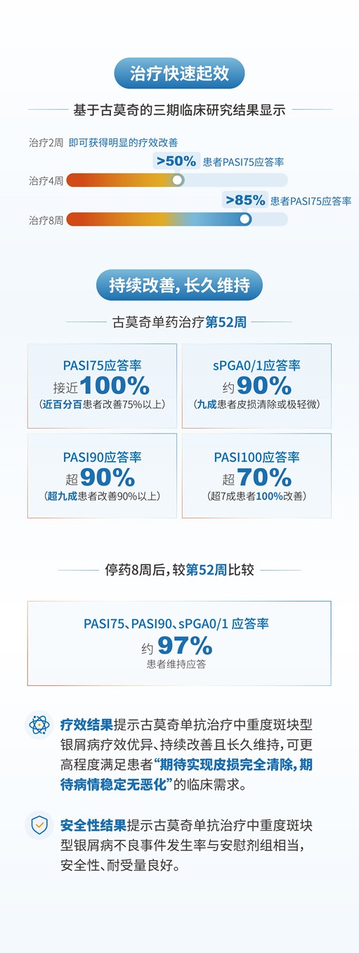 长期治疗随访最终结果显示,古莫奇单抗治疗中重度斑块型银屑病在长期维持以及进一步改善疗效方面的能力突出,较已上市同靶点药物获得更高的应答率,为银屑病患者达到更高治疗目标提供了更优的新选择。