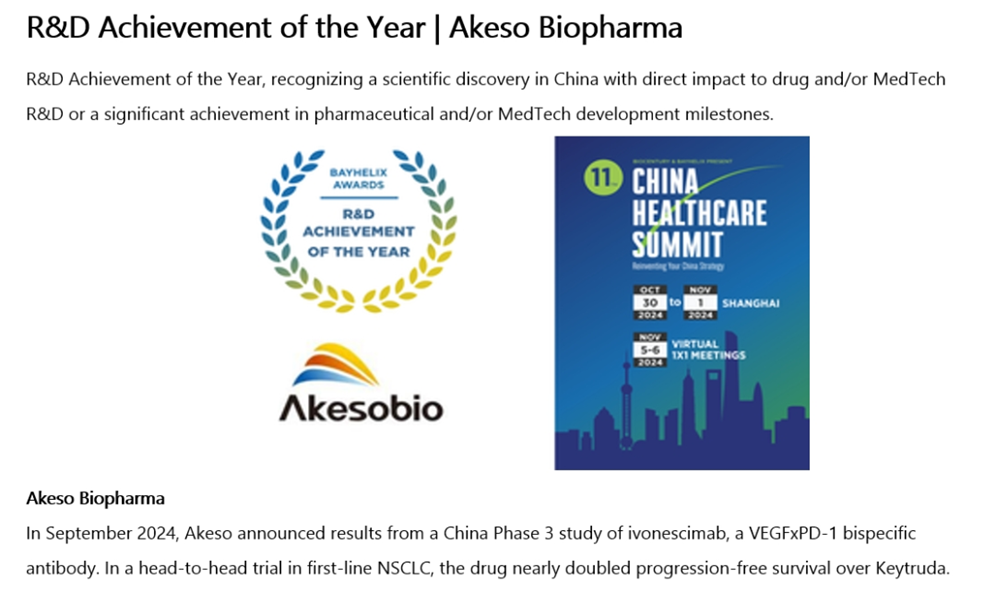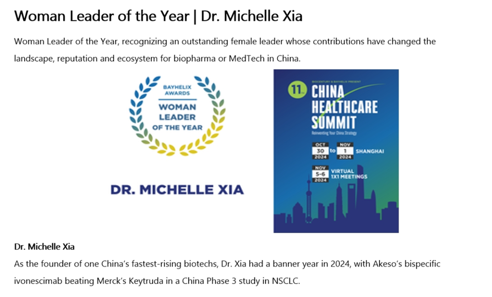 BioCentury-BayHelix年度大奖旨在表彰在中国医疗健康生态系统中取得杰出成就和贡献的个人和公司,包括年度研发成就奖、年度最佳交易奖、年度最佳商业成就奖、年度最佳公司奖以及年度杰出女性领袖奖。