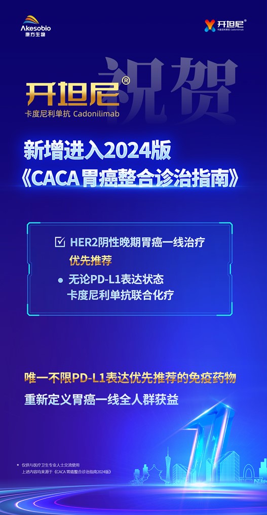 近日,在中国抗癌协会(CACA)主办的2024中国整合肿瘤学大会(CCHIO)上,《CACA胃癌整合诊治指南2024版》正式发布,安博官方网页版生物全球首创的PD-1/CTLA-4双特异性抗体开坦尼®(卡度尼利单抗注射液)被推荐为一线治疗晚期胃癌全人群的首选方案,成为该指南中唯一一个不限PD-L1表达的优先推荐肿瘤免疫治疗药物。