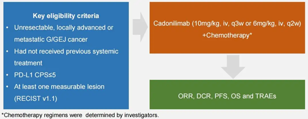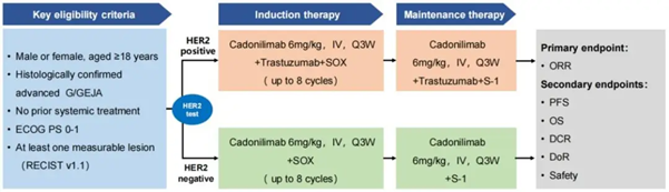 未接受治疗的G/GEJA患者接受卡度尼利单抗+SOX(HER2阴性患者)或卡度尼利单抗+曲妥珠单抗+SOX(HER2阳性患者)治疗最多8个周期,随后使用S-1(替吉奥)+卡度尼利单抗维持治疗,(HER2阳性患者加用曲妥珠单抗,HER2阴性患者不加用),直至病情进展或出现无法耐受的毒性。主要终点是ORR,次要终点是DCR、PFS、OS和安全性(图3)。