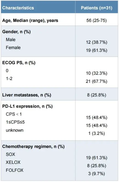 PD-1抑制剂联合化疗是转移性G/GEJA的标准一线治疗,但对于PD-L1表达较低的患者,其疗效仍然不佳。一项Ⅲ期研究[3]表明,PD-1/CTLA-4双特异性抗体卡度尼利单抗在未接受过治疗的转移性G/GEJA患者中表现出令人鼓舞的疗效和可控的安全性,即使是PD-L1 CPS<5的患者也是如此。目前,卡度尼利单抗联合XELOX(奥沙利铂联合卡培他滨)作为转移性G/GEJA的一线治疗已获得国家药品监督管理局(NMPA)批准。本研究介绍了该组合在真实世界中对PD-L1 CPS≤5的转移性G/GEJA的最新疗效和安全性。