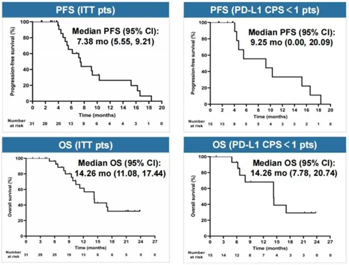 截至2024年8月24日,共入组31例患者。基线时中位年龄为56.0岁(范围:25岁-75岁),67.7%为ECOG PS 1/2,48.4%为PD-L1 CPS<1(表1)。4例患者在MDT指导下接受手术治疗,其中3例PD-L1 CPS<1。所有患者的安全性和有效性均可评估。17例达到部分缓解(PR),14例达到疾病稳定(SD)。总体ORR为54.8%,DCR为100.0%(表2)。中位PFS为7.38个月(95% Cl:5.55-9.21),中位OS为14.26个月(95% Cl:11.08-17.44)(图2)。PD-L1 CPS<1组ORR为53.3%(8/15),DCR为100.0%(15/15),中位PFS为9.25个月(95% Cl:0.00~20.09),中位OS为14.26个月(95% Cl:7.78~20.74)(图2)。肝转移患者(25.8%,8/31)的ORR(8例PR,100%)高于总体ORR(54.8%)(表1)。67.7%的患者出现TRAE,其中3级TRAE占9.7%(中性粒细胞减少6.5%,血小板减少3.2%,糖尿病3.2%)。未发生4/5级毒性。
