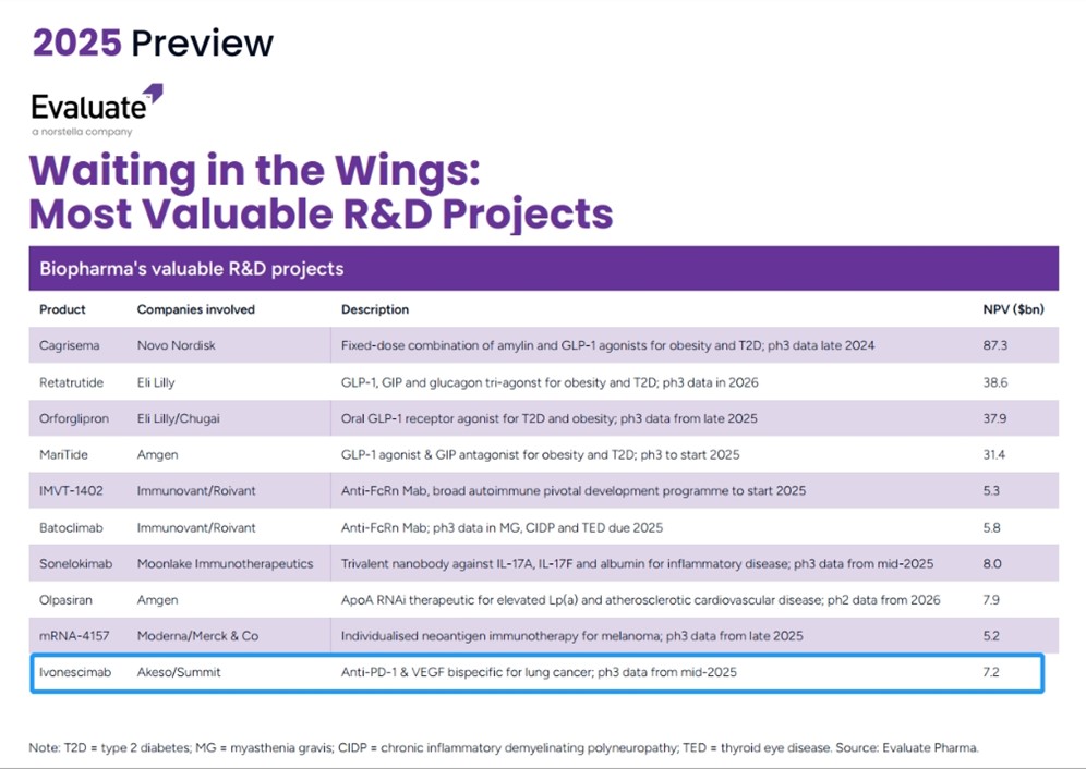 近日,全球医疗领域领先的行业咨询及市场调研机构Evaluate发布了2025年制药行业展望(2025 Preview:What does the year ahead hold for pharma?)深度报告,以预测2025年全球医药市场发展格局。安博官方网页版生物自主研发的全球首创PD-1/VEGF双特异性抗体新药依沃西凭借其卓越的创新价值与市场潜力,入选“全球最具价值研发项目(Most Valuable R&D Projects)”榜单,是该榜单中唯一一款来自中国创新药企自主研发的药物。