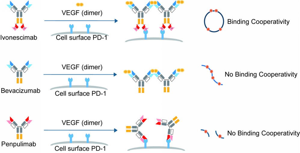 借助Fortebio Octet分析、ELISA、流式细胞术等多种先进实验方法,研究人员深入探究了依沃西与PD-1和VEGF的结合动力学及亲和力。实验结果表明,依沃西协同结合PD-1和VEGF,形成一个更加稳定的“簇”复合物。这种复合物的形成显著增强了依沃西对两个靶点的结合亲和力。