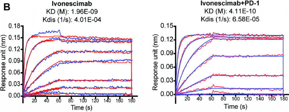 图2 依沃西单抗可同时结合PD-1和VEGF,并具有协同结合效应