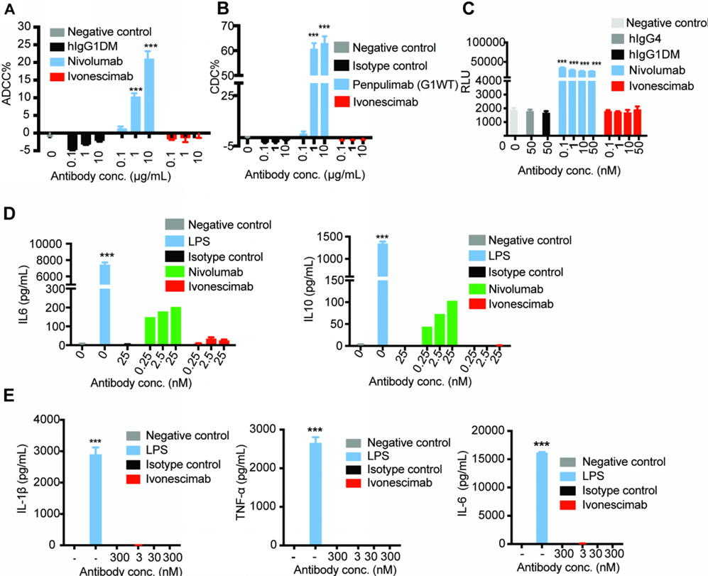 依沃西的Fc区域经过特殊工程改造,引入了L234A和L235A两个关键突变位点。这一改造能够阻断FcγRI/IIIa的结合,从而有效抑制Fc介导的多种效应功能,包括抗体依赖的细胞介导的细胞毒性(ADCC)、补体依赖的细胞毒性(CDC)、抗体依赖的细胞吞噬作用(ADCP)以及抗体依赖的细胞因子释放(ADCR)。此外,该改造还显著减少了人外周血单个核细胞(HPMMs)炎症细胞因子的释放。