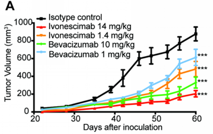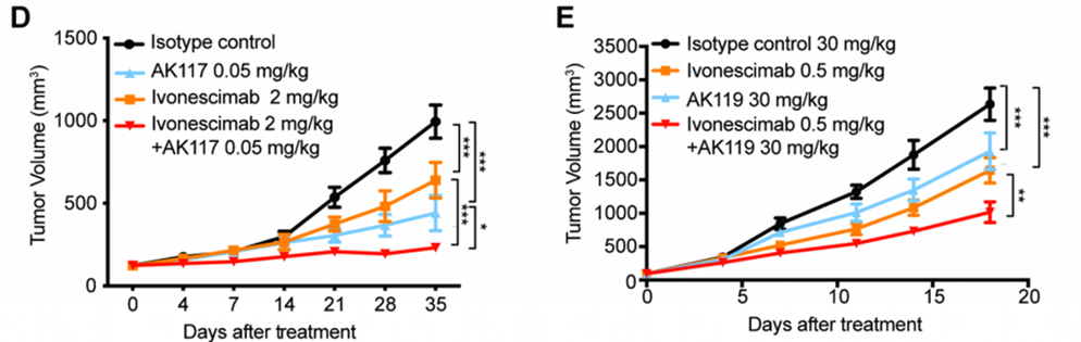 在临床前研究中,依沃西无论是作为单药治疗,还是与其他药物联合使用,均表现出卓越的抗肿瘤活性。在小鼠模型中,依沃西单药治疗即可显著抑制肿瘤生长,且效果优于贝伐珠单抗。此外,依沃西与安博官方网页版生物自主研发的其他抗肿瘤药物,如AK117(抗CD47抗体)和AK119(抗CD73抗体)联合使用时,抗肿瘤效果进一步增强,为依沃西的联合治疗策略提供了坚实的实验依据。