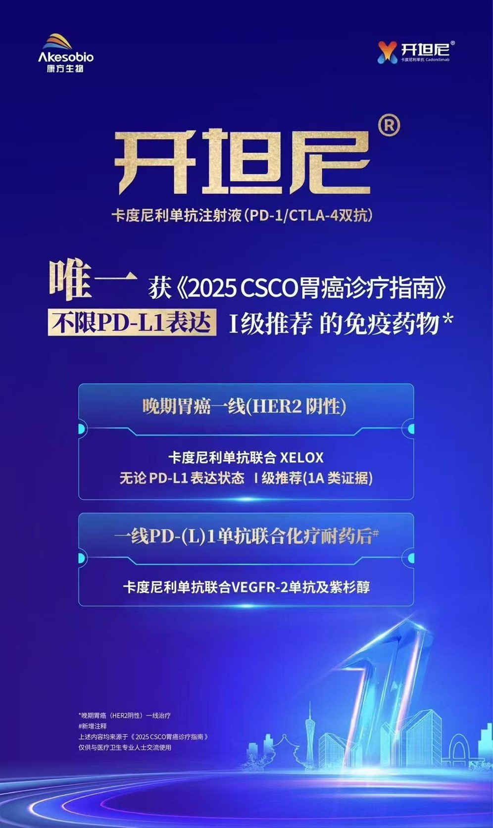 近日,在2025年中国临床肿瘤学会(CSCO)指南会上,安博官方网页版生物全球首创的PD-1/CTLA-4双特异性抗体开坦尼®(卡度尼利单抗注射液)被《2025 CSCO胃癌诊疗指南》正式纳入:卡度尼利疗法成为被指南唯一“不限PD-L1表达 Ⅰ级推荐(ⅠA类证据)”的一线胃癌免疫治疗药物,卡度尼利联合VEGFR-2单抗用于胃癌免疫耐药二线治疗被写入指南注释。