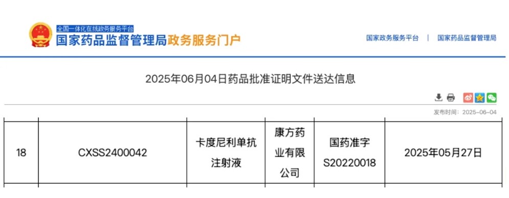 2025年6月4日,国家药品监督管理局(NMPA)官网显示,公司独立自主研发的全球首创PD-1/CTLA-4双特异性抗体开坦尼®(卡度尼利单抗注射液)联合含铂化疗联合或不联合贝伐珠单抗一线治疗持续、复发或转移性宫颈癌的新适应症已于5月27日获得批准上市。