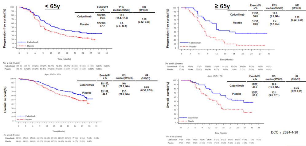 无论患者年龄如何,卡度尼利单抗均显著延长患者PFS和OS,其中≥65岁老年人群获益尤为突出(PFS HR=0.39,OS HR=0.49),mOS达26.6个月(vs 15.1个月),为高龄人群提供了高效且安全性可控的治疗选择。