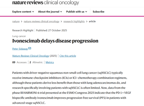 《Nature Reviews Clinical Oncology》则重点关注了依沃西在疗效上的突破性价值,尤其是在“全人群一致获益”上。其评论指出当前临床上的痛点问题:与肺腺癌相比,鳞状NSCLC患者从现有标准治疗中的获益历来有限,且该领域专项研究匮乏,存在明确的未满足临床需求。