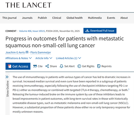 荷兰鹿特丹伊拉斯姆斯大学医学中心的Joachim G. Aerts与Floris Dammeijer教授受《柳叶刀》特邀作为HARMONi-6研究结果评论专家,在文章中明确指出,靶向VEGF通路在肺癌治疗中意义重大,但在sq-NSCLC中的应用因高毒性率(主要是致命性出血事件)而受限,在此之前,VEGF通路相关药物仅被批准用于nsq-NSCLC患者。