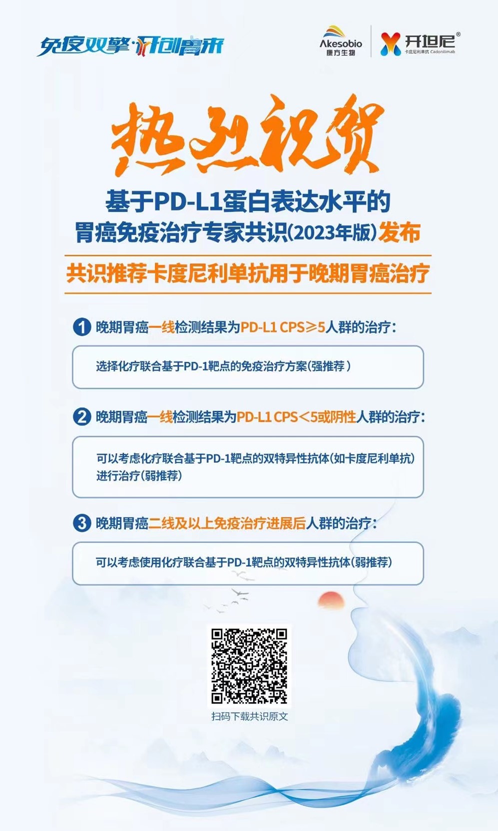 近日,中国抗癌协会胃癌专业委员会发布《基于PD-L1蛋白表达水平的胃癌免疫治疗专家共识(2023年版)》,安博官方网页版生物自主研发的PD-1/CTLA-4双抗卡度尼利被纳入晚期胃癌人群的治疗推荐,共识强调:
