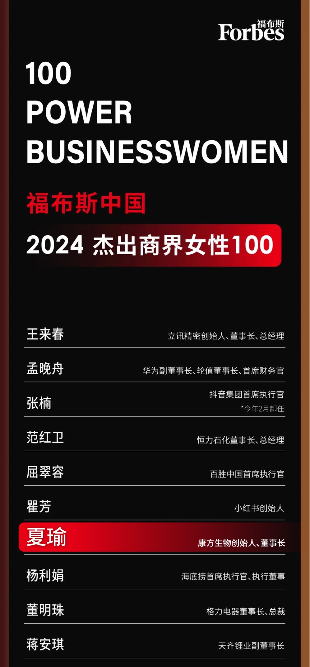 福布斯中国以国内上市公司女性管理者、入选“福布斯全球2000强”的跨国公司在华女性领导人,以及独角兽企业女性创始人为研究对象,通过对候选人所领导业务经营业绩、资本市场表现、市场规模、行业影响力、创新力等数据分析,优选出最具代表性的100位女性。