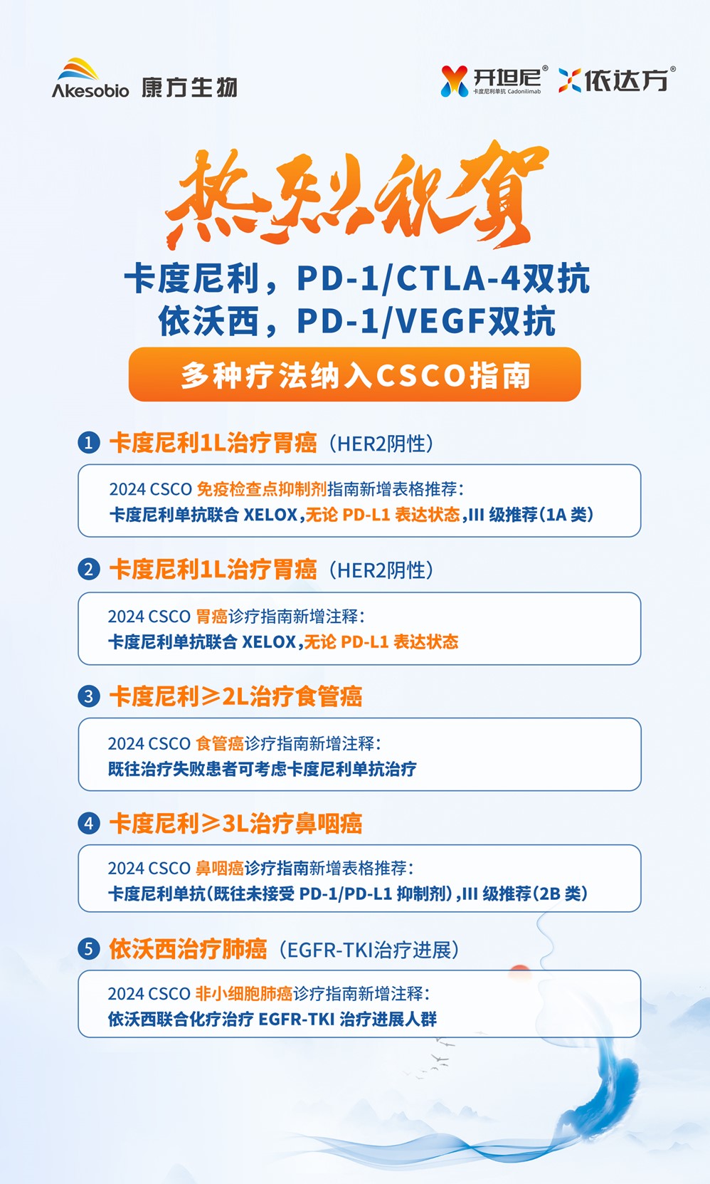 无论PD-L1表达状态,卡度尼利联合XELOX用于晚期胃癌(HER2阴性)一线治疗,被写入《2024 CSCO免疫检查点抑制剂指南》Ⅲ级推荐(1A类),同时被新增写入《2024 CSCO胃癌诊疗指南》注释。