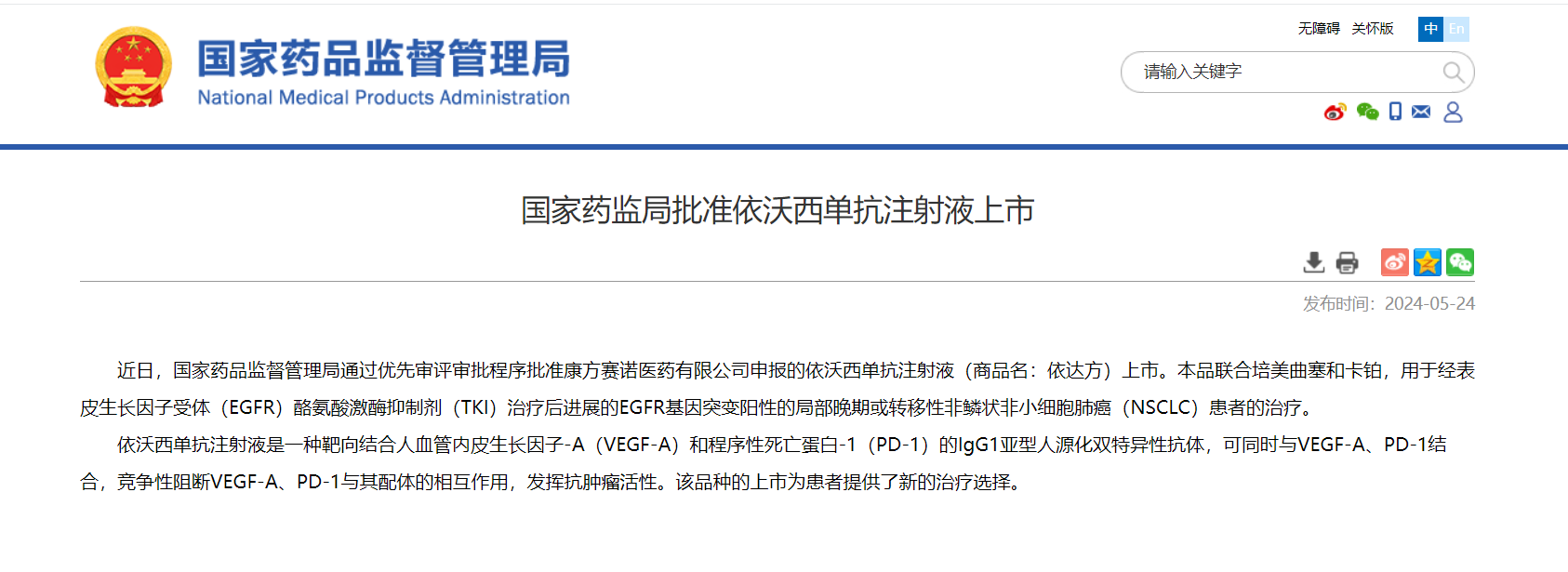 2024年5月24日,国家药品监督管理局(NMPA)官网显示,安博官方网页版生物(9926.HK)独立自主研发的全球首创的PD-1/VEGF双特异性抗体新药依达方®(通用名:依沃西单抗注射液)正式获批上市,适应症为联合化疗治疗经表皮生长因子受体(EGFR)酪氨酸激酶抑制剂(TKI)治疗后进展的EGFR突变的局部晚期或转移性非鳞状非小细胞肺癌(nsq-NSCLC)。